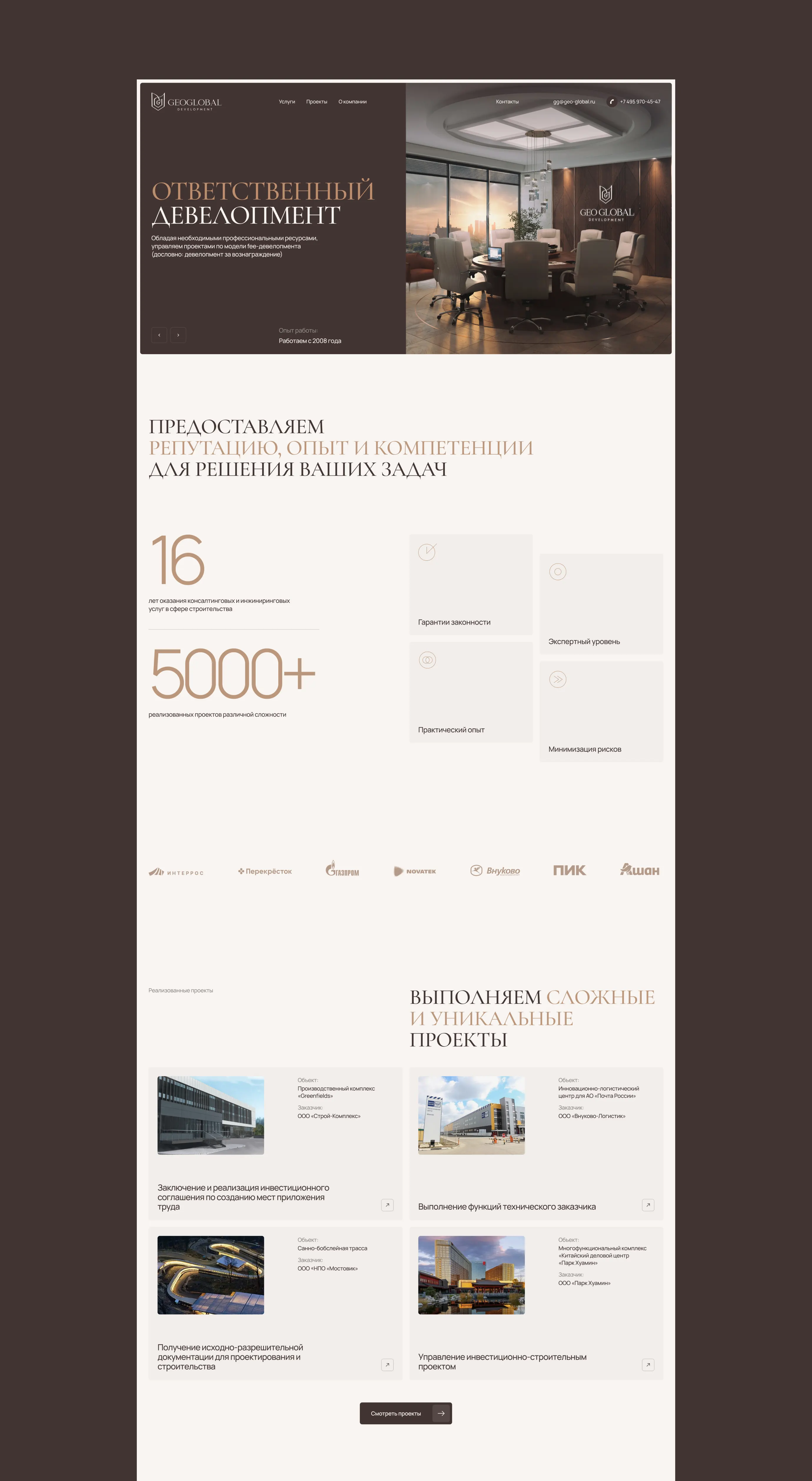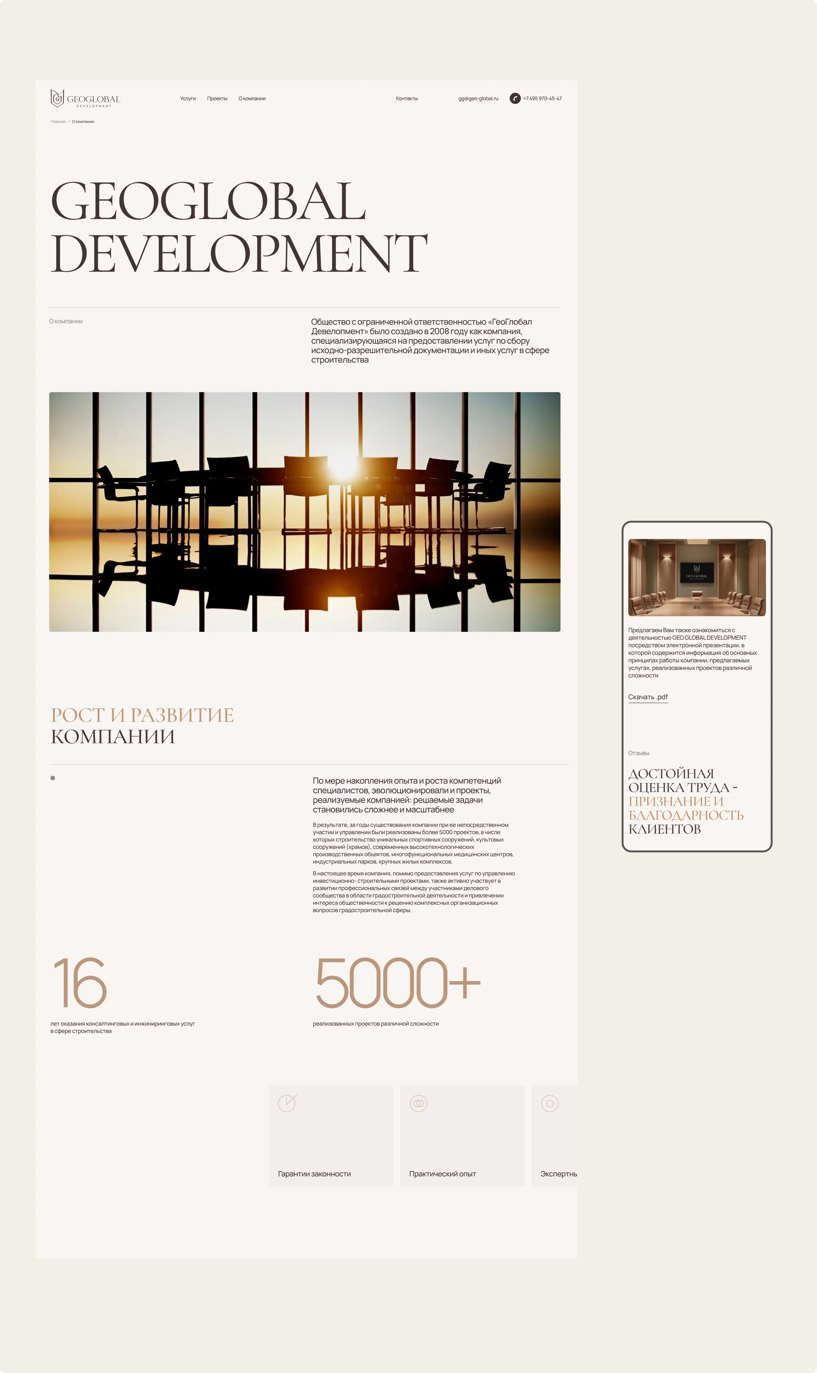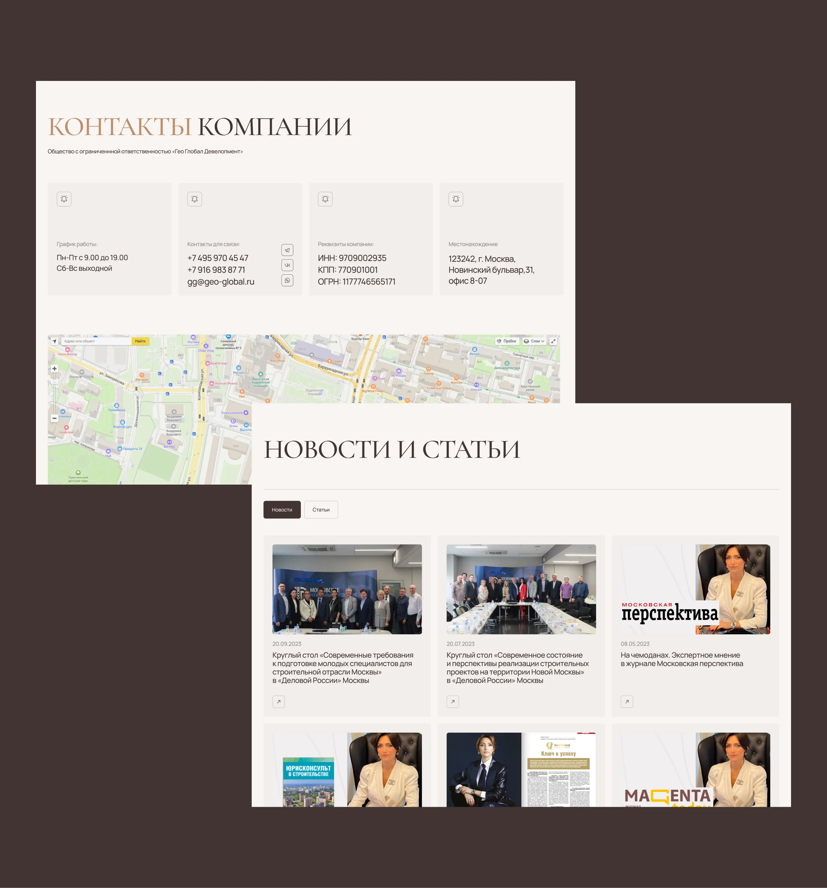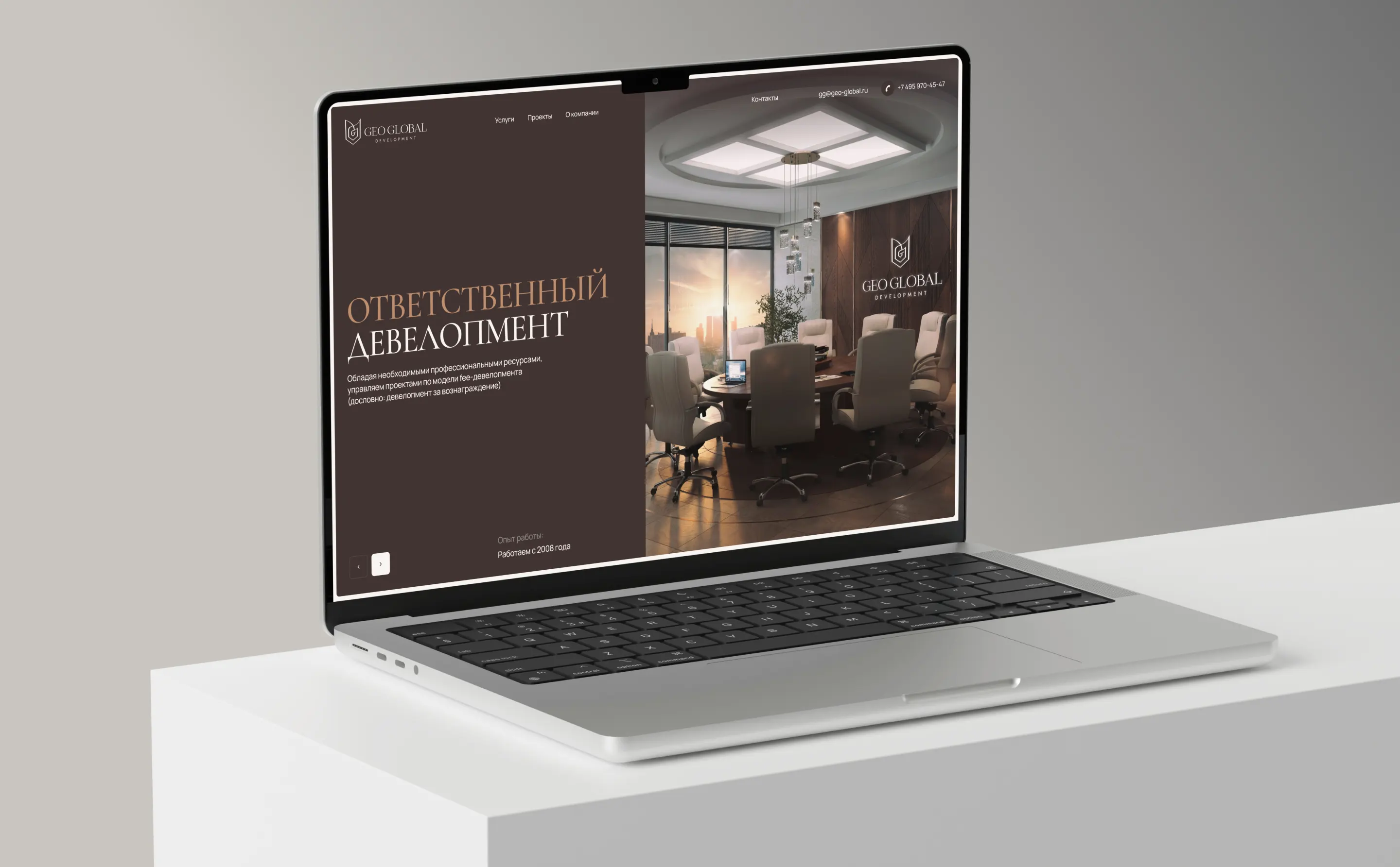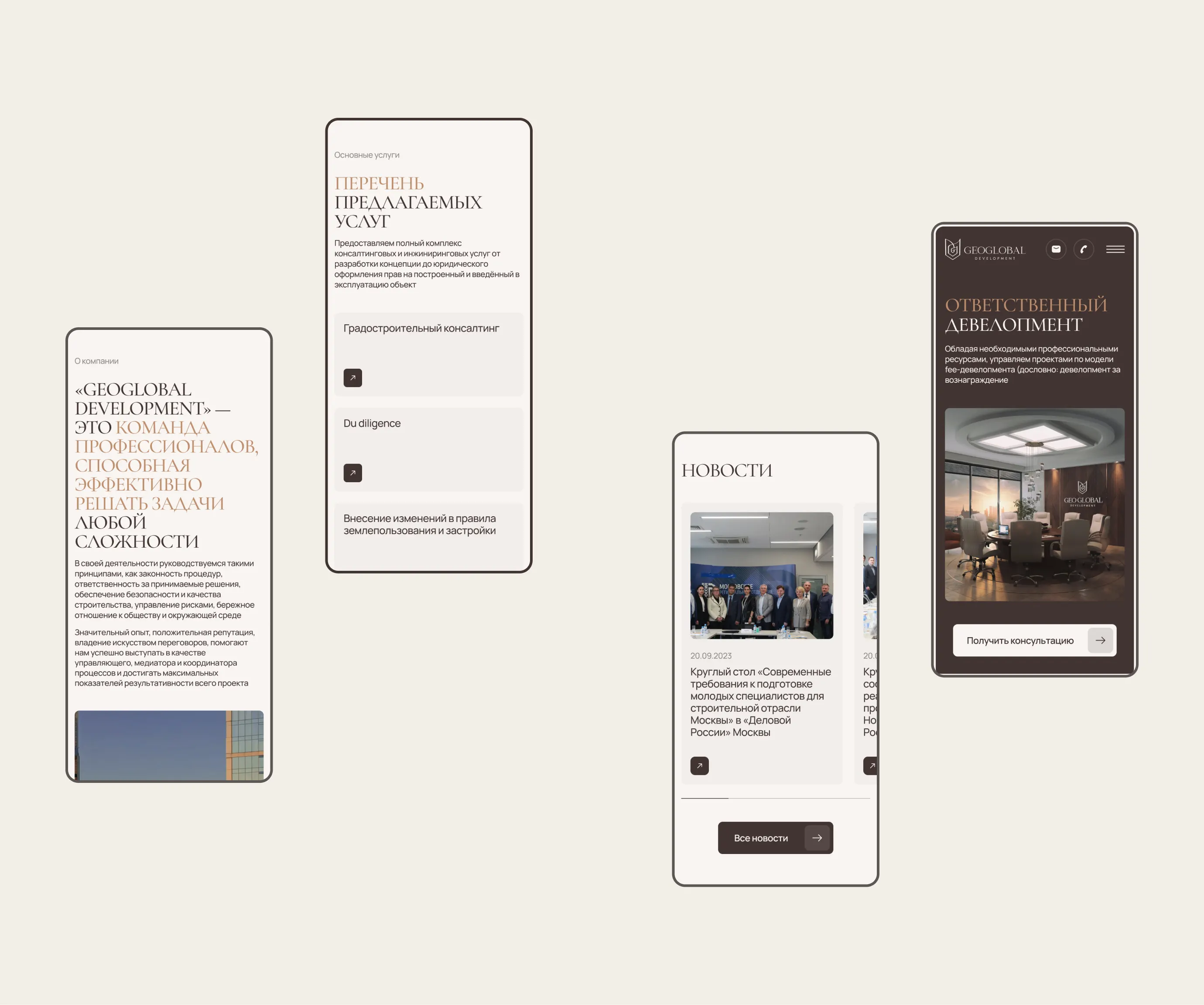 Компания GeoGlobal предоставила нам свой логотип и фирменный стиль, что стало отправной точкой для разработки концепции веб-сайта в рамках их брендбука. Мы выбрали светло-бежевый цвет в качестве основного, дополнив его акцентными тёмно-коричневым и золотым. Для заголовков секций мы использовали шрифт антиква, выполненный полностью прописными буквами, что подчеркнуло статусность и многолетний опыт компании. Этот выбор шрифта отлично сочетался с логотипом, создавая гармоничное визуальное единство.