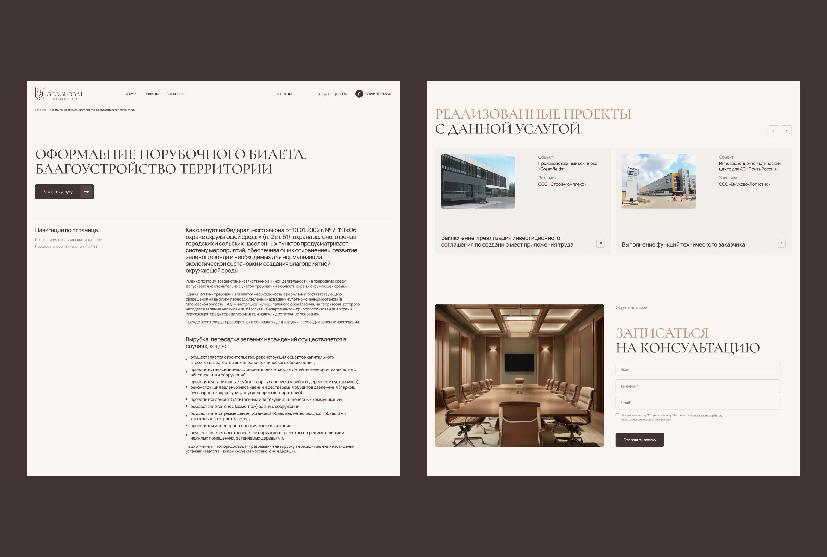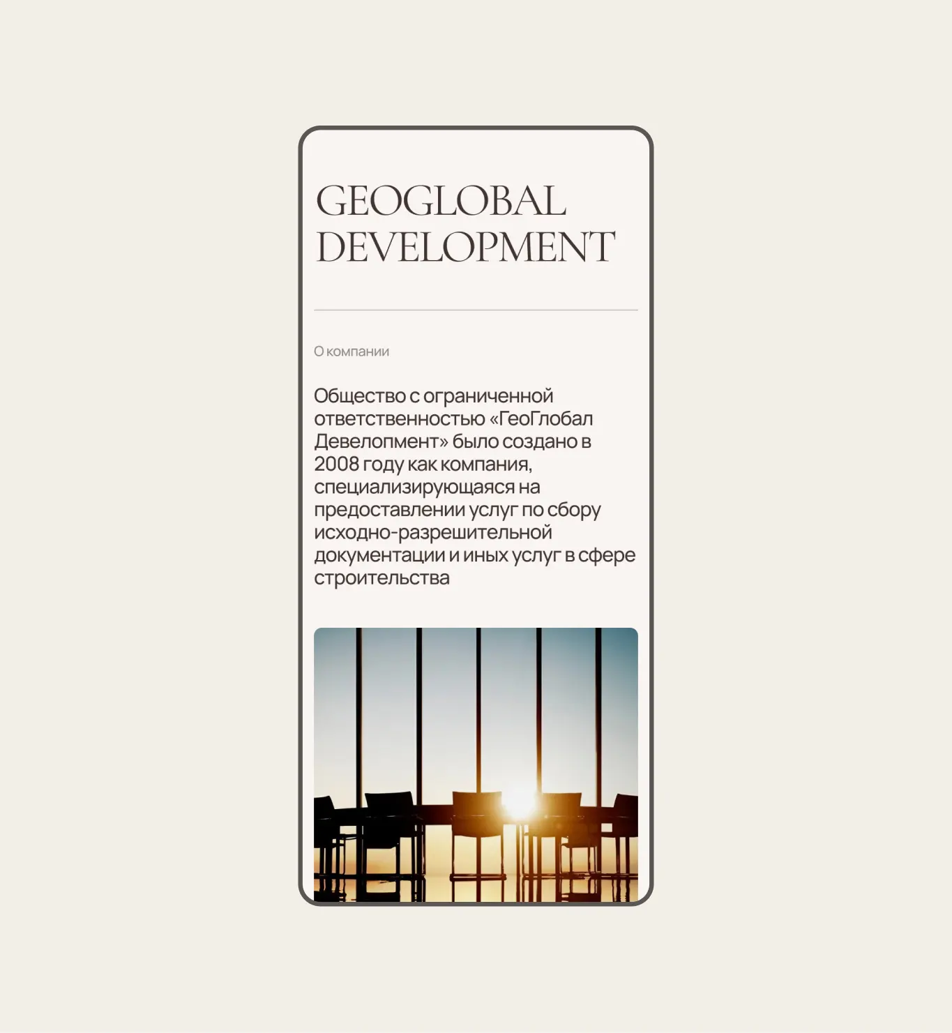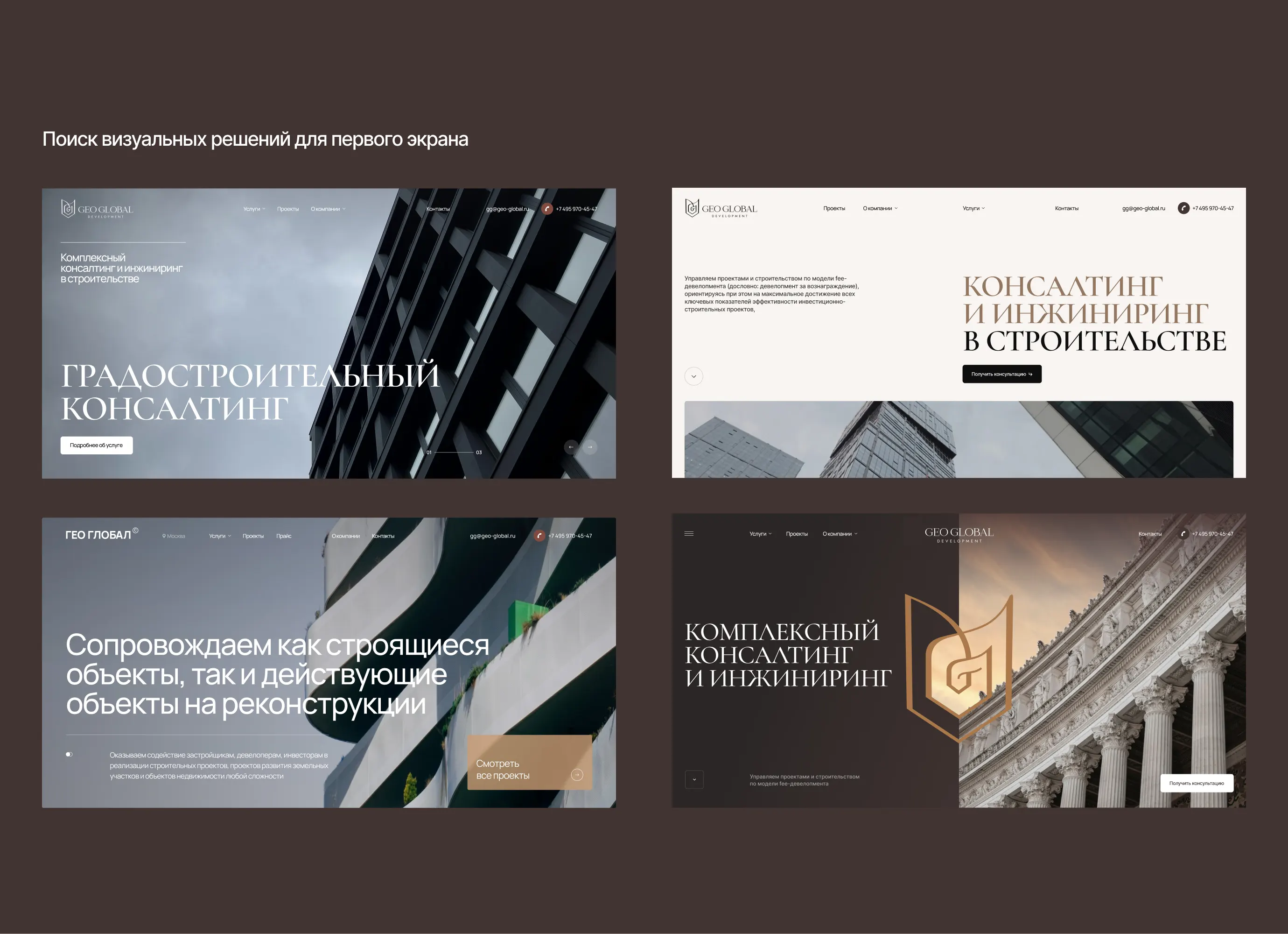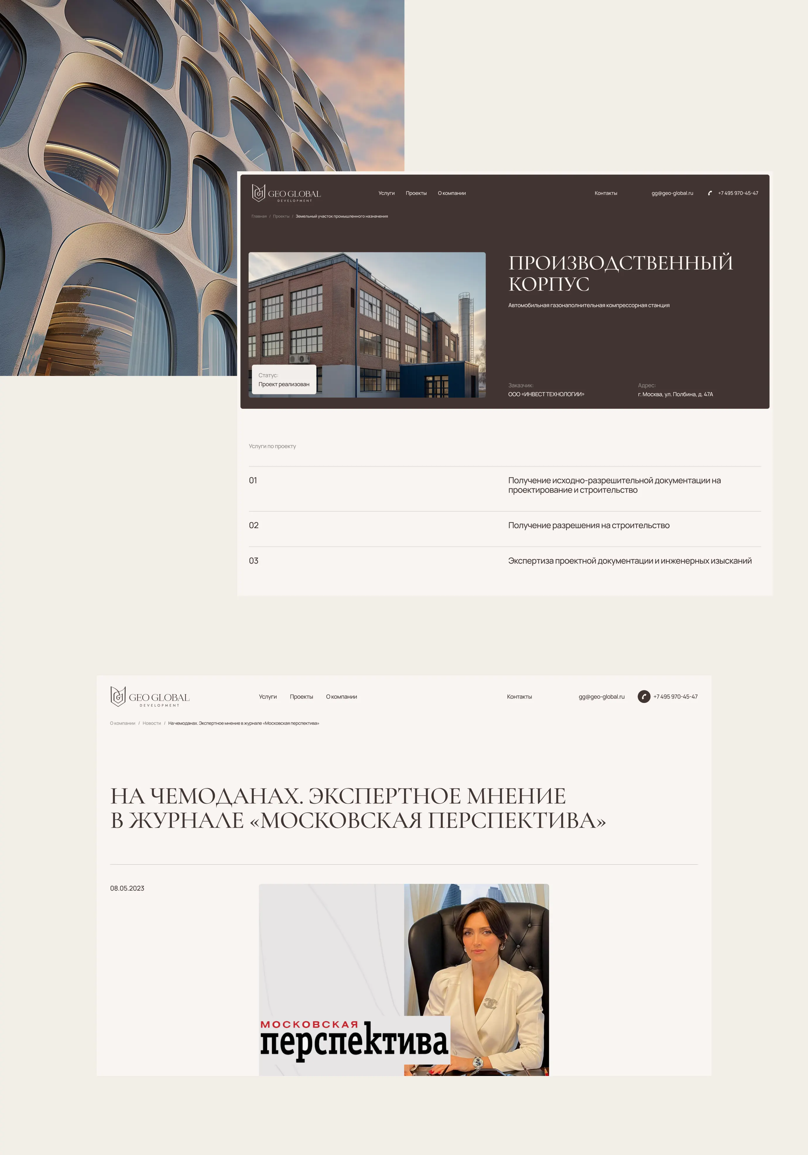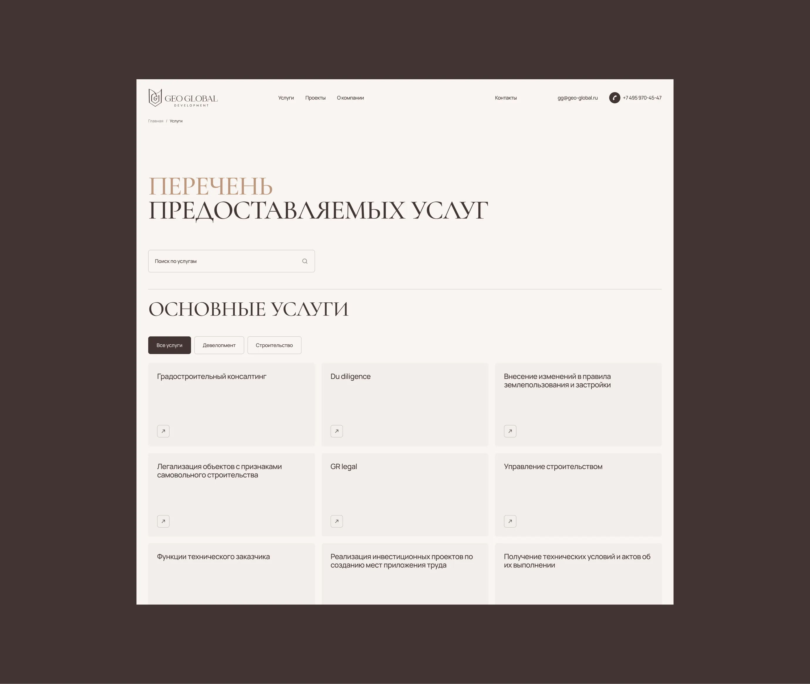 Компания GeoGlobal предоставила нам свой логотип и фирменный стиль, что стало отправной точкой для разработки концепции веб-сайта в рамках их брендбука. Мы выбрали светло-бежевый цвет в качестве основного, дополнив его акцентными тёмно-коричневым и золотым. Для заголовков секций мы использовали шрифт антиква, выполненный полностью прописными буквами, что подчеркнуло статусность и многолетний опыт компании. Этот выбор шрифта отлично сочетался с логотипом, создавая гармоничное визуальное единство.
