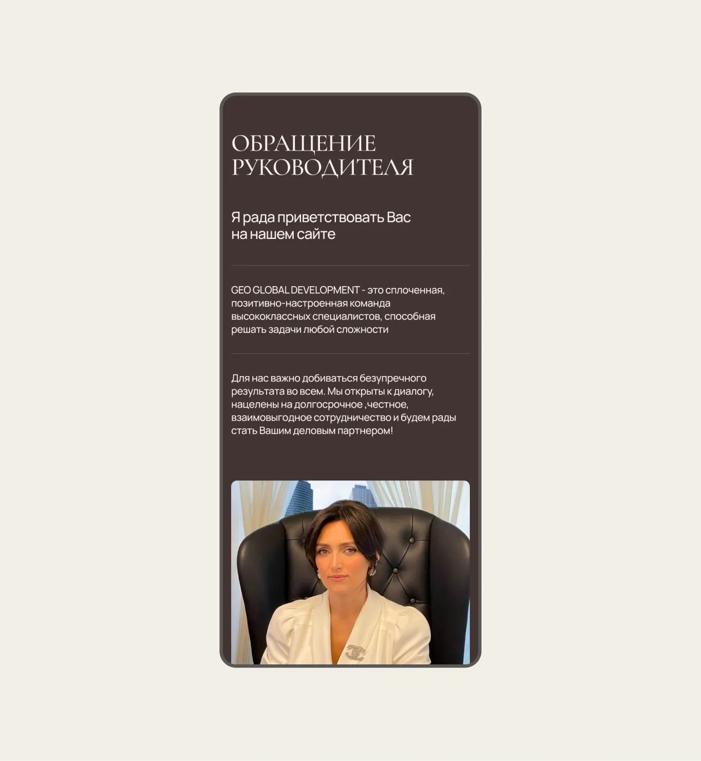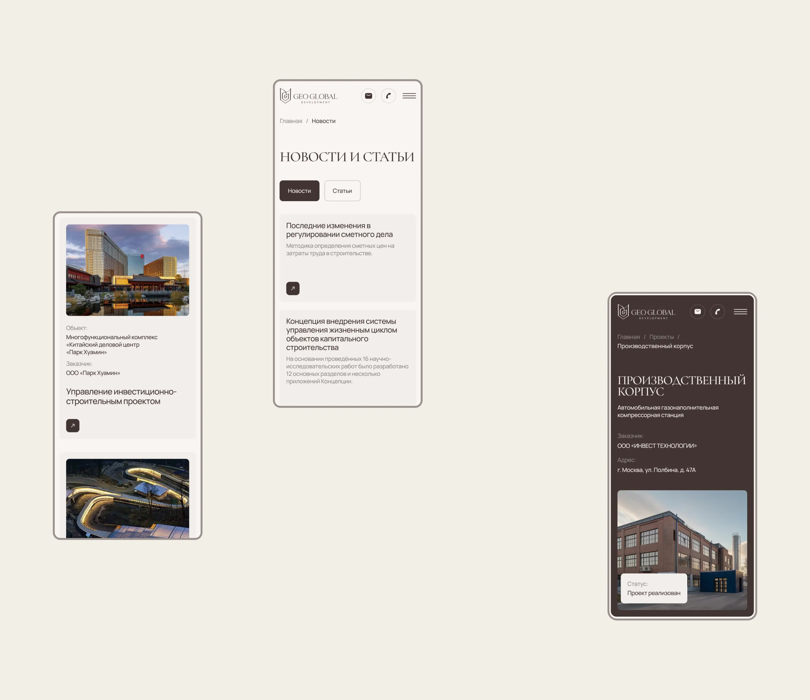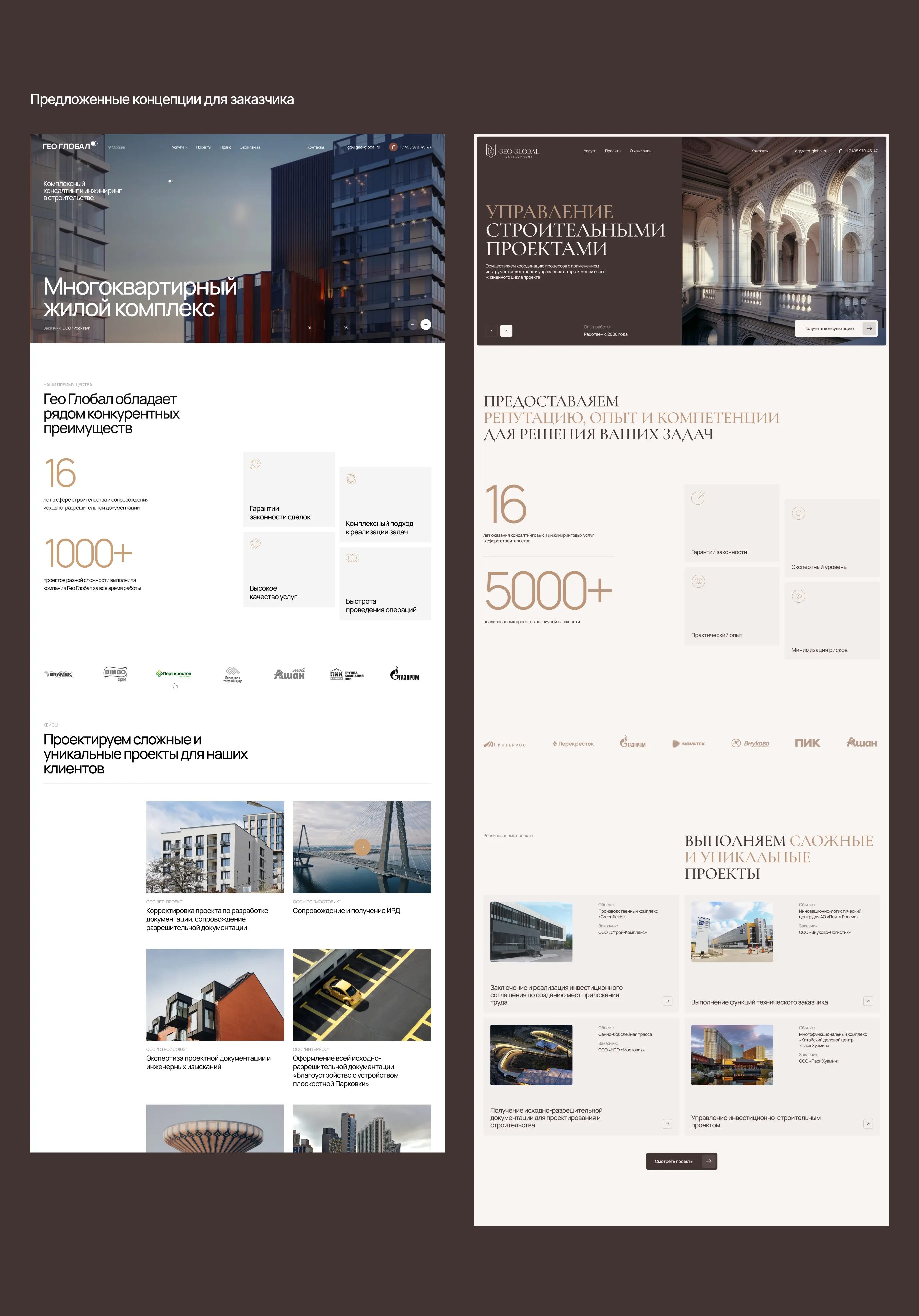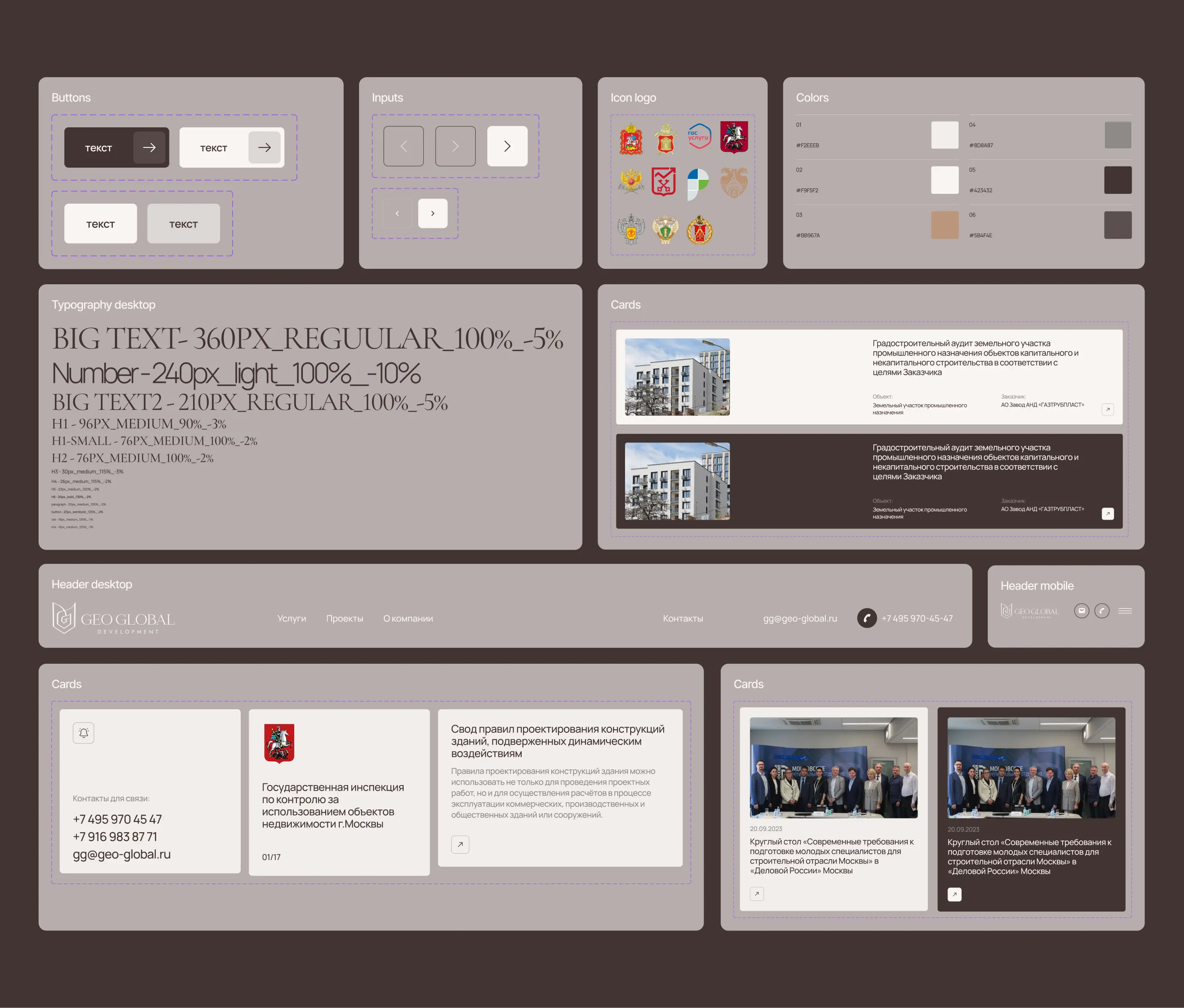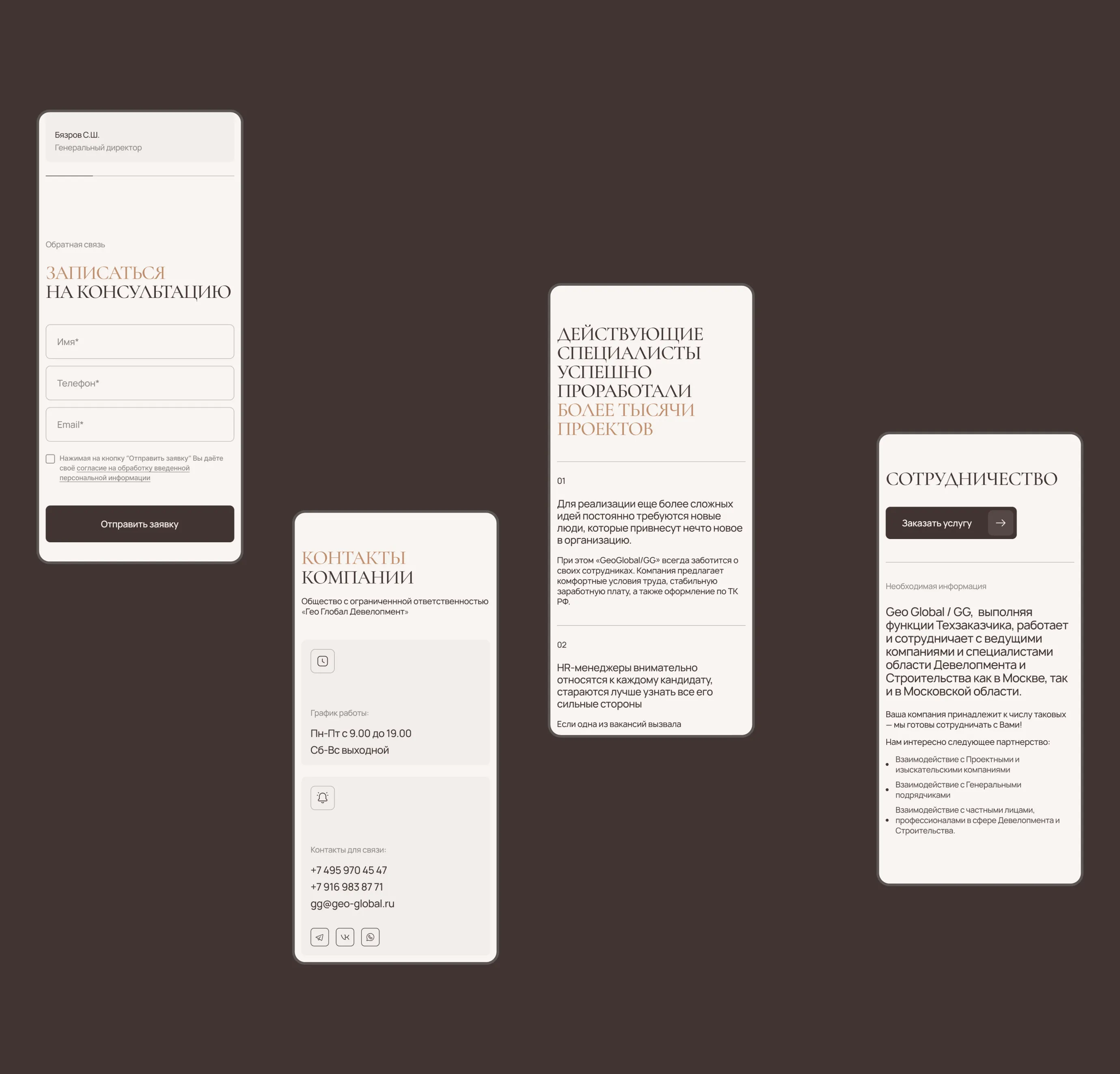 Компания GeoGlobal предоставила нам свой логотип и фирменный стиль, что стало отправной точкой для разработки концепции веб-сайта в рамках их брендбука. Мы выбрали светло-бежевый цвет в качестве основного, дополнив его акцентными тёмно-коричневым и золотым. Для заголовков секций мы использовали шрифт антиква, выполненный полностью прописными буквами, что подчеркнуло статусность и многолетний опыт компании. Этот выбор шрифта отлично сочетался с логотипом, создавая гармоничное визуальное единство.