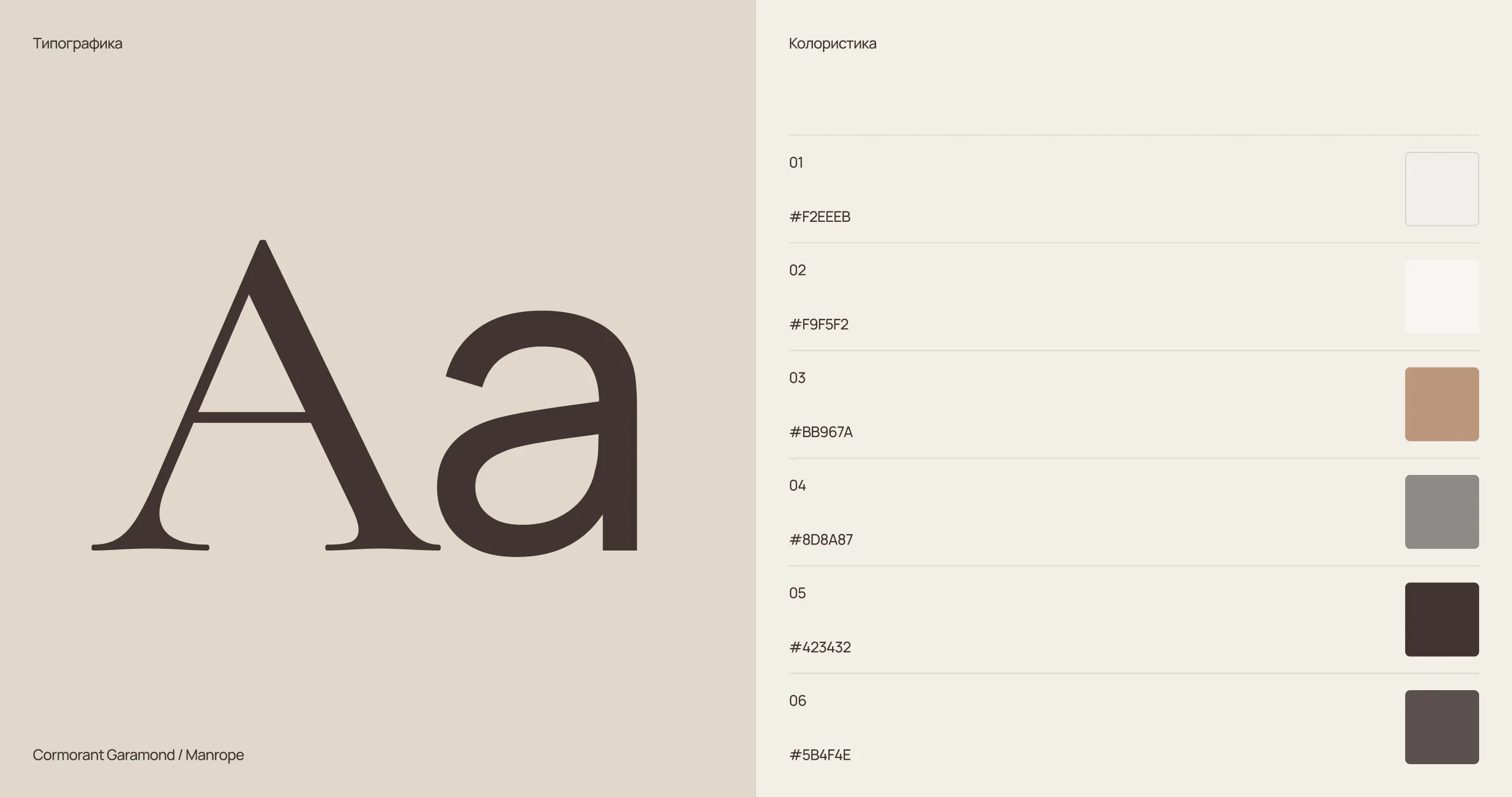 - По цвету опирались на фирменный стиль компании. В брендбуке были завялены светло-бежевые цвета, коричневые и акцентный золотой. Согласовали выбранные цвета с клиентом и продолжили разработку концепции.