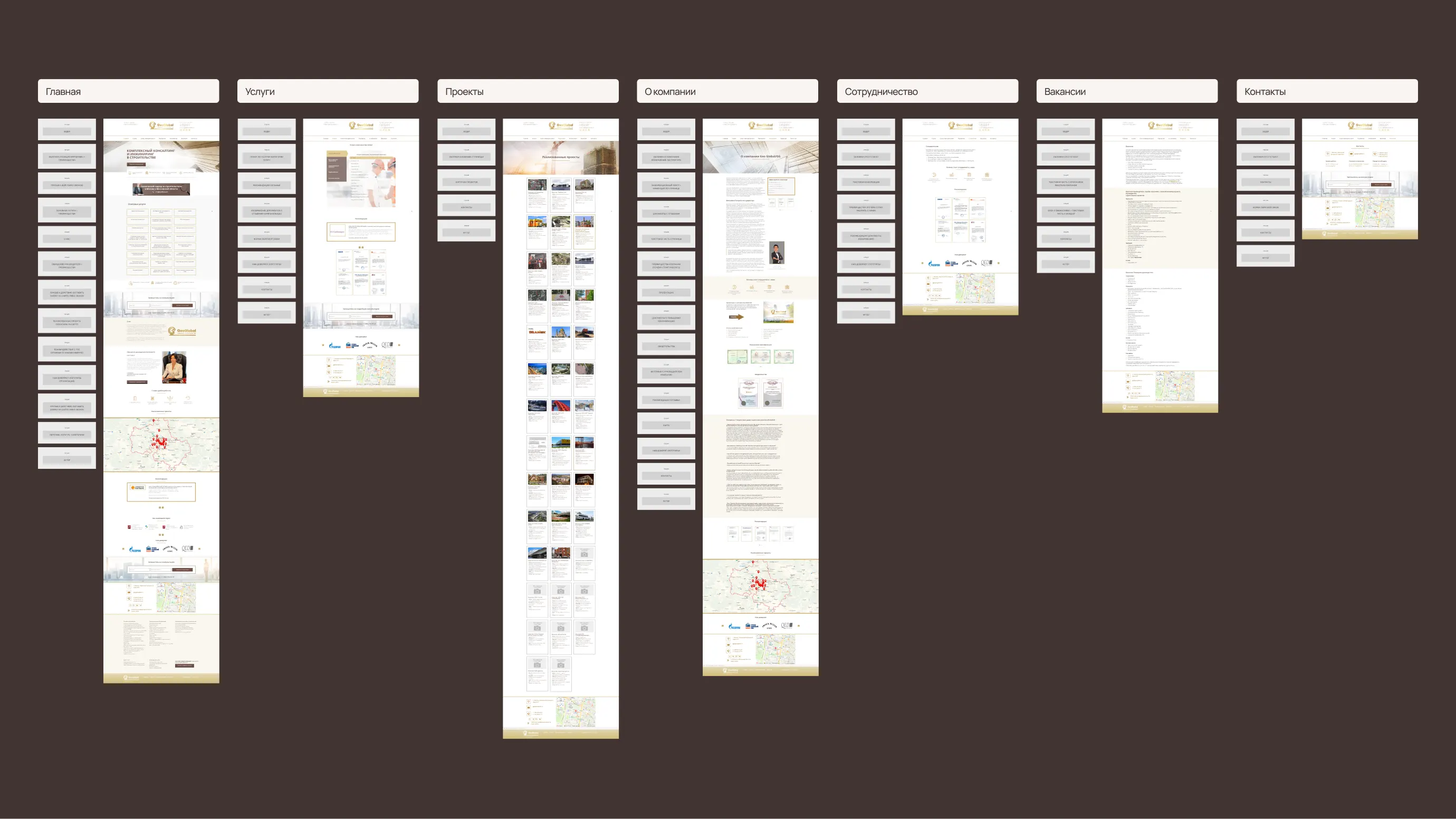 На этапе проектирования мы разработали User Flow для каждого сегмента целевой аудитории, определив последовательность действий пользователей для достижения их целей. Мы проанализировали текущий веб-сайт и сайты конкурентов, сделали скриншоты страниц для выявления используемых блоков. На основе этого анализа мы создали новую структуру сайта и определили расположение блоков на каждой странице.