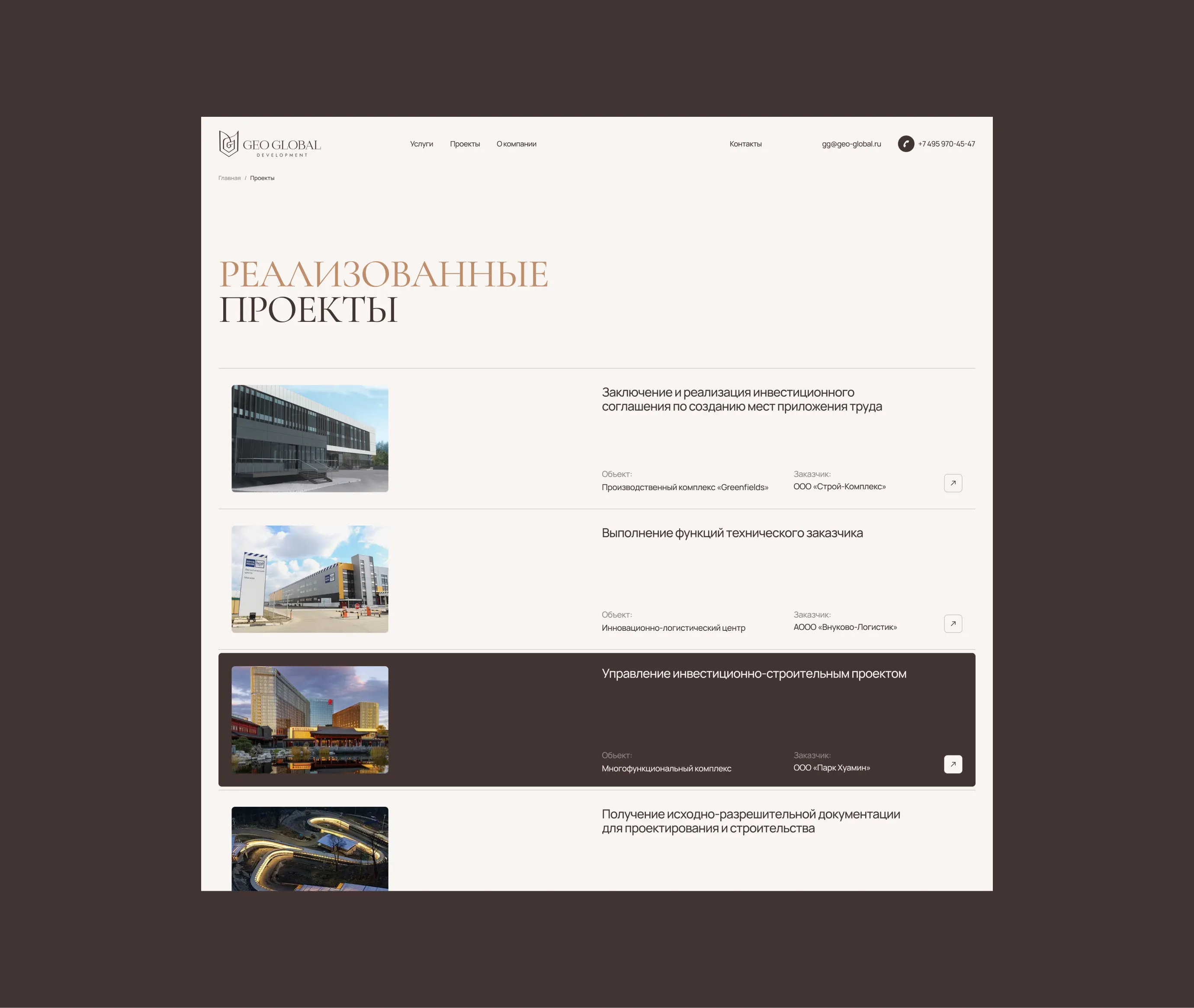 - Страница проекта была дополнена детальной информацией о предоставляемых услугах, блоком с реализованными проектами по данной услуге, изображениями и основными услугами компании.